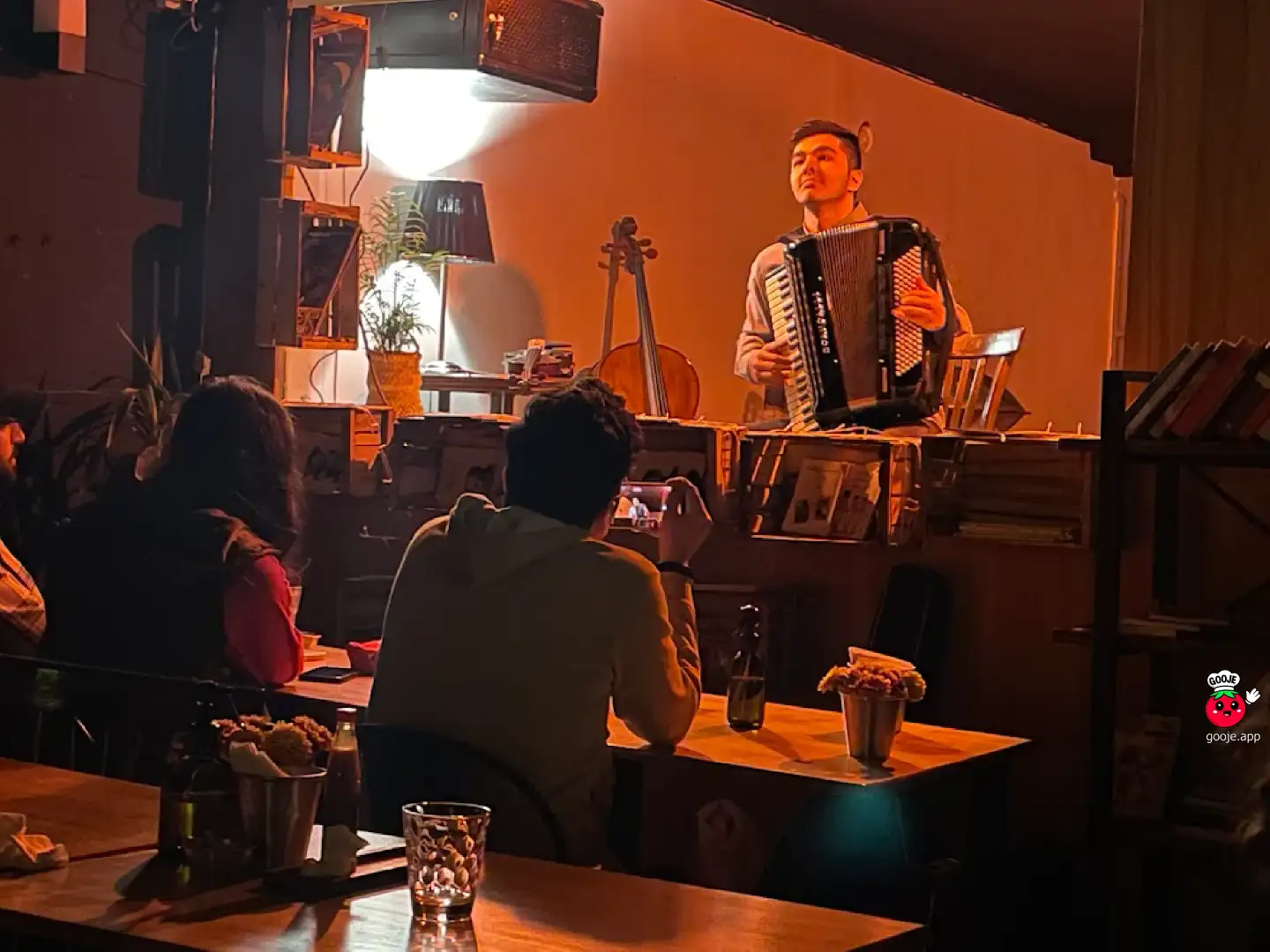 You can eat some of the menu's food until break time. Listen at a small music salon.